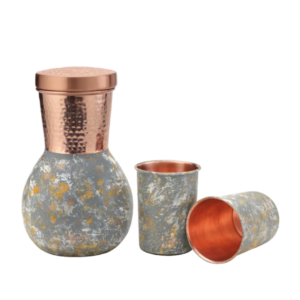 Introducing Marina Jug—a copper jug set with two matching glasses, showcasing a creative matka-inspired design for a...