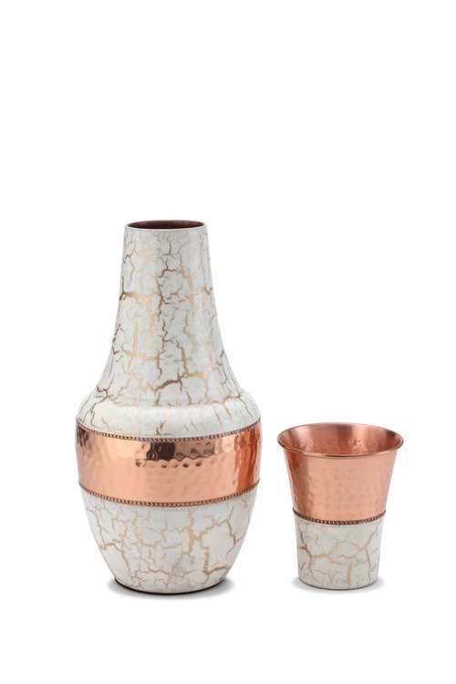Behold the Vintage Carafe, a 1500ml copper masterpiece that stands as a testament to the unparalleled fusion of art and craftsmanship. A marvel from our esteemed Crack Series, this carafe embodies the essence of vintage charm, seamlessly blended with the sophistication of marble aesthetics. The cap, ingeniously crafted, doubles as a glass, completing the Vintage Carafe as a full product in one.