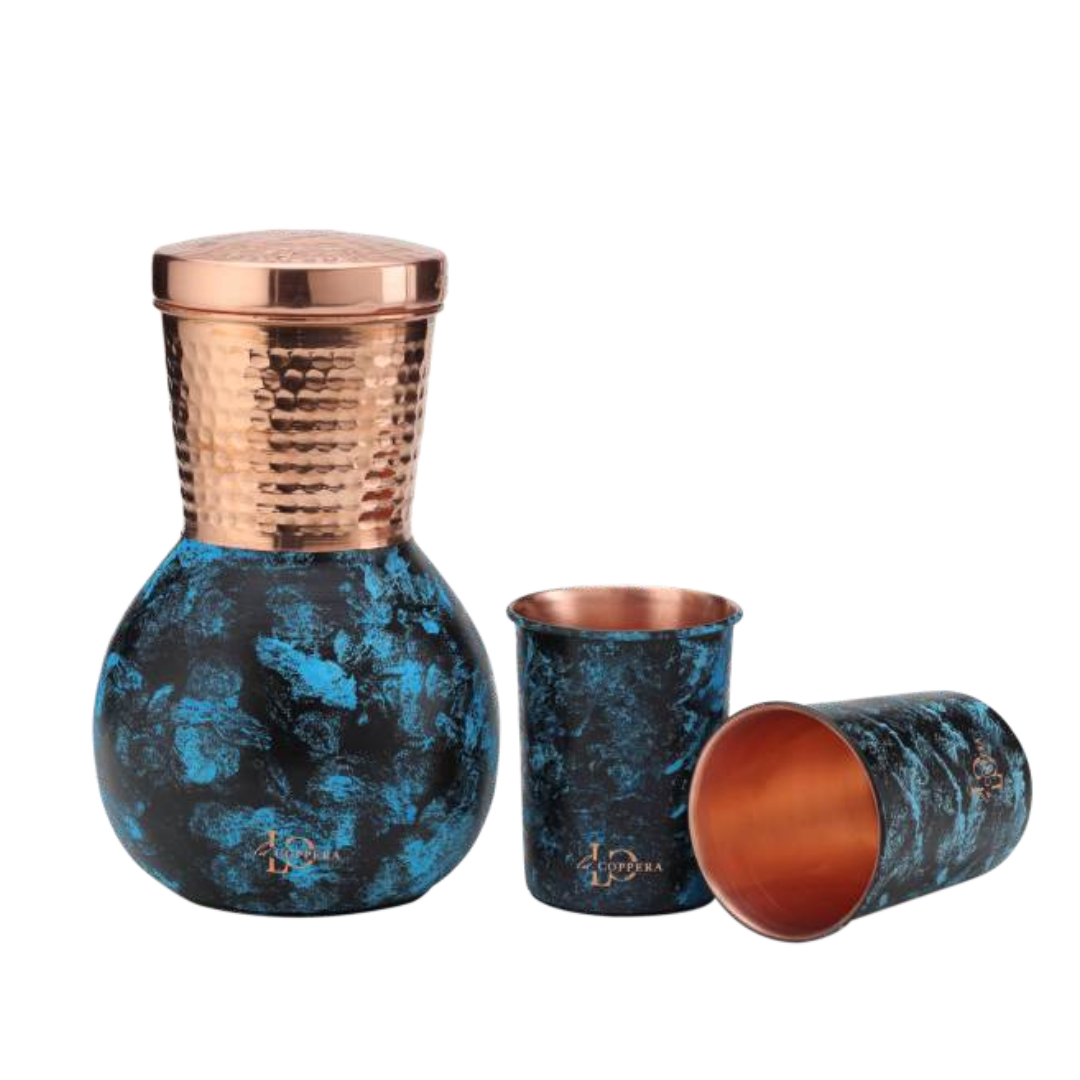 In the misty dawn of India’s rich heritage, where artisans’ hands danced with passion and precision, La Coppera’s Mist Vanavaibhav was born. This exquisite, handcrafted copper ensemble whispers tales of a bygone era, where elegance and refinement reigned supreme. As the vibrant hues and regal designs on the copper bottle and glasses shimmer in the light, they evoke the majestic beauty of India’s royal courts, inviting you to experience the art of refined living, one sip at a time.