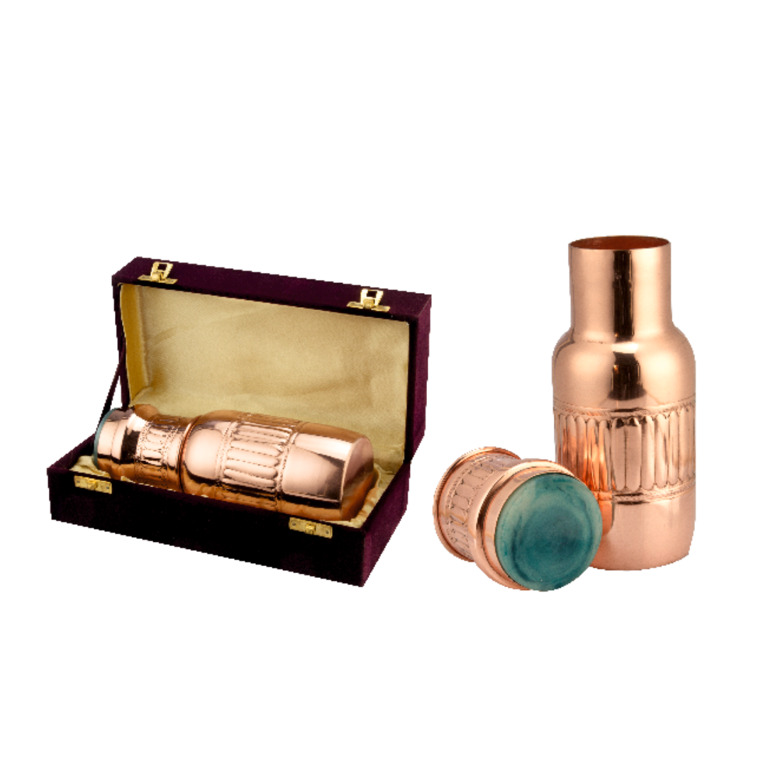 Introducing the Everyday Carafe Brush from our Marble series—an exquisite copper carafe with a distinctive half-and-half design. The top half showcases a textured hammered copper exterior, while the bottom half features a smooth marble look and feel. The functional lid doubles as a glass, accompanied by two matching glasses that echo the carafe’s elegance. Packaged in a luxurious Kappa import box with copper foiling, this set combines style and functionality which makes it perfect for gifting.